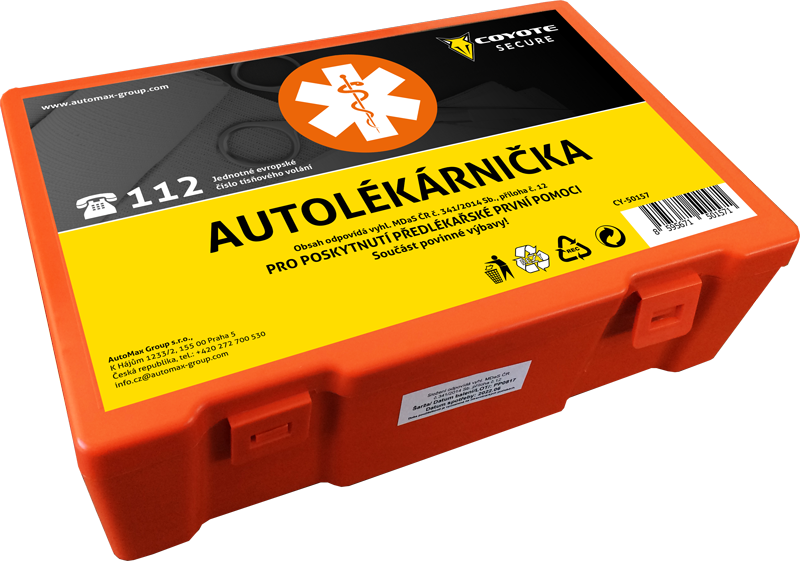 Car first aid kit size I. in plastic box. Box size 26 x 17 x 78 cm. Car first aid kit is part of the mandatory equipment of cars. The first-aid kit complies with Decree No 341/2002 Coll., as amended by Decree No 216/2010 Coll., Decree No 182/2011 Coll. and Decree No 341/2014 Coll., annexes