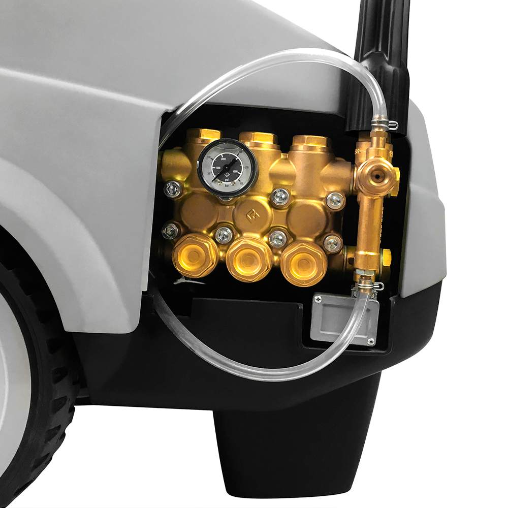 Regulovatelný průtok 900 l/h a pracovní tlak až 250 bar určuje tuto myčku k intenzivnímu průmyslovému použití.