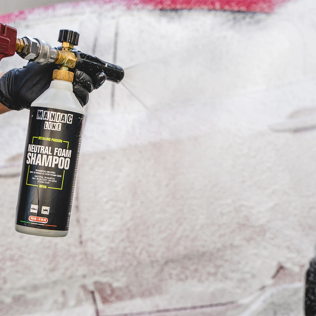 U přípravku pro předmytí „MANIAC - předmytí pro pěnové pistole“ zůstává pěna kompaktní a přilne k povrchu, čímž snadněji změkčuje odolné nečistoty, zatímco přípravek „MANIAC - neutrální šampon“ má vysokou lubrikační schopnost a velké poměry ředění až 1 : 400, ale mnohem nižší povrchovou přilnavost, a proto není doporučen pro odolné nečistoty.