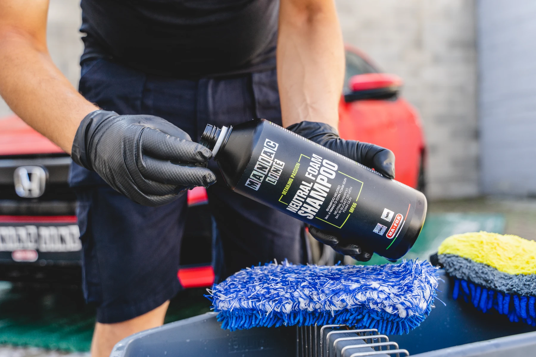 ① Ruční mytí pomocí mycí rukavice: vytváří měkký, kompaktní a lubrikovaný pěnový film, díky kterému je bezpečný na jakémkoli typu povrchu a umožňuje mýt vůz bez rizika tvorby kruhových škrábanců nebo mikroškrábanců. Respektuje jakýkoli typ dříve aplikované ochrany a má vynikající hospodárnost díky velkým poměrům ředění až 1 : 400 (1 díl přípravku a 400 dílů vody).