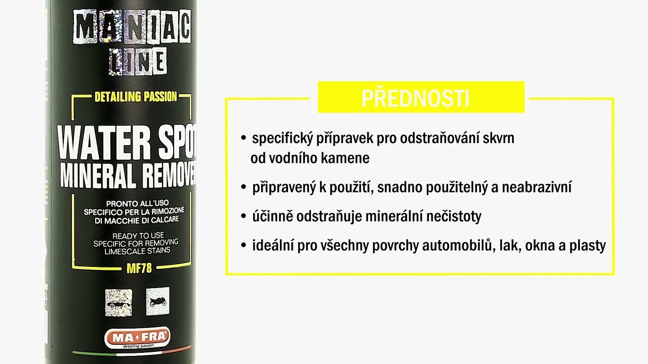 Vodní kámen na povrchu působí podobně jako zubní kámen na naše zuby. Zubní kámen je způsoben minerálními usazeninami, které se tak pevně přichytí k zubu, že jej nelze odstranit běžným zubním kartáčkem. Není to hned vidět, ale postupem času, jak zakoření, může způsobit vážné škody. Totéž platí pro naše vozidla, vodní kámen je tvořen zbytky, které nelze odstranit pouhým všeobecným mytím. Usazuje se v místech, kde se drží voda, jako je například sedlo matic kol, lišty nebo emblémy. Při nahromadění zmatní barvu karoserie a zašpiní okna. To znamená, že je nutné jej odstranit pomocí přípravku „MANIAC - odstranění vodních spotů a minerálů“, což je specifický přípravek schopný rozpustit vodní kámen při respektování materiálů, na kterých je ukotven. Mimo jiné vodní kámen nelze odstranit mechanickou dekontaminací pomocí clayovací tyčinky Clay bar. Abychom rozpustili vápenaté minerály, které tvoří vodní kámen, musíme provést chemickou dekontaminaci přípravkem „MANIAC - odstranění vodních spotů a minerálů“. To ale nejsou jediné nečistoty, které se mohou na voze vyskytovat. Pokud objevíte kontaminaci minerály železa způsobené znečištěním, lze ji odstranit přípravkem „MANIAC - odstraňovač železa“. Více se můžete dozvědět při zhlédnutí příslušeného videa. Výsledkem bude nově vyčištěný povrch.