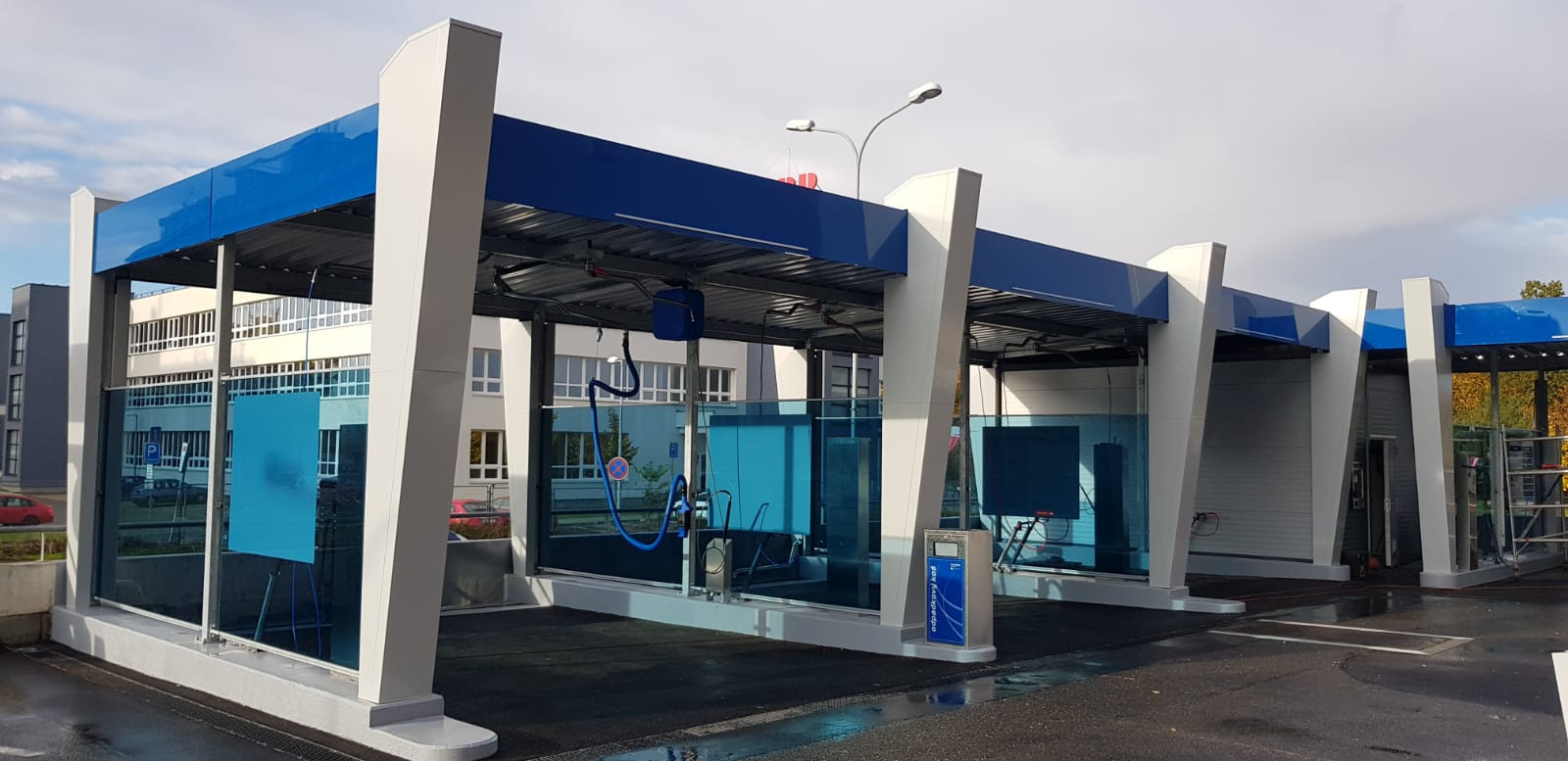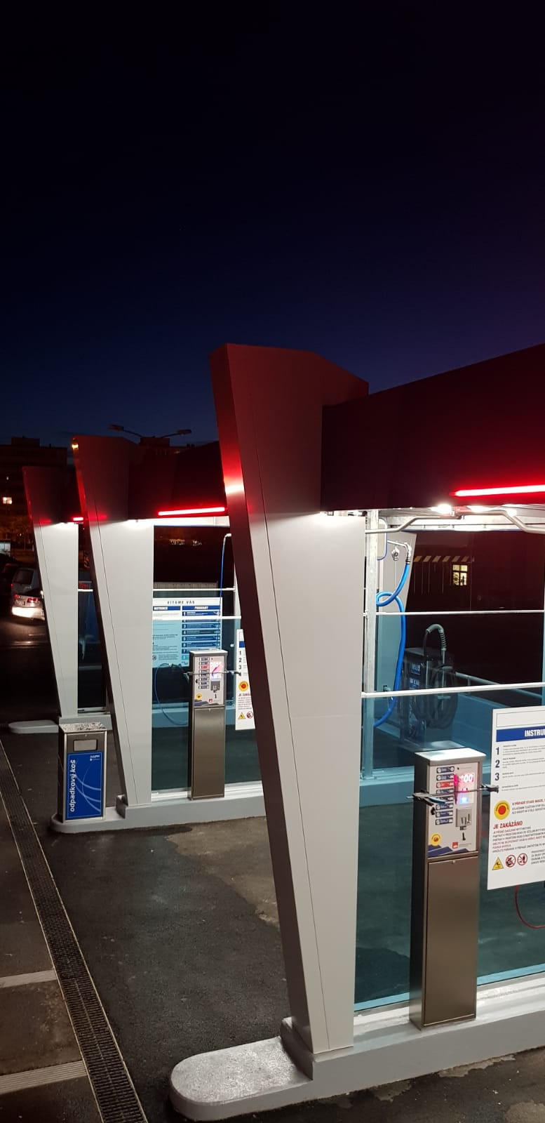 V novom samoobslužnom umývacom centre v OC Novodvorská sme použili aj nový dizajn. Umývačka sa nachádza na vyvýšenom otvorenom parkovisku pre zákazníkov nákupného centra. Preto sme boli pri budovaní umývacieho centra obmedzovaní priestorom. V dôsledku toho sme umiestnili štyri umývacie zálivy v tvare písmena L.
