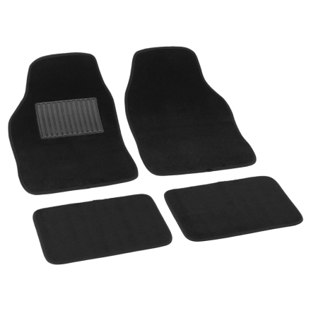 Univerzálne textilné čierne a šedé koberce do automobilu. Súprava 4 kusov (2x predný diel, 2x zadný diel). Veľkosť predného koberca 64 x 43 cm, zadného 41 x 29 cm.