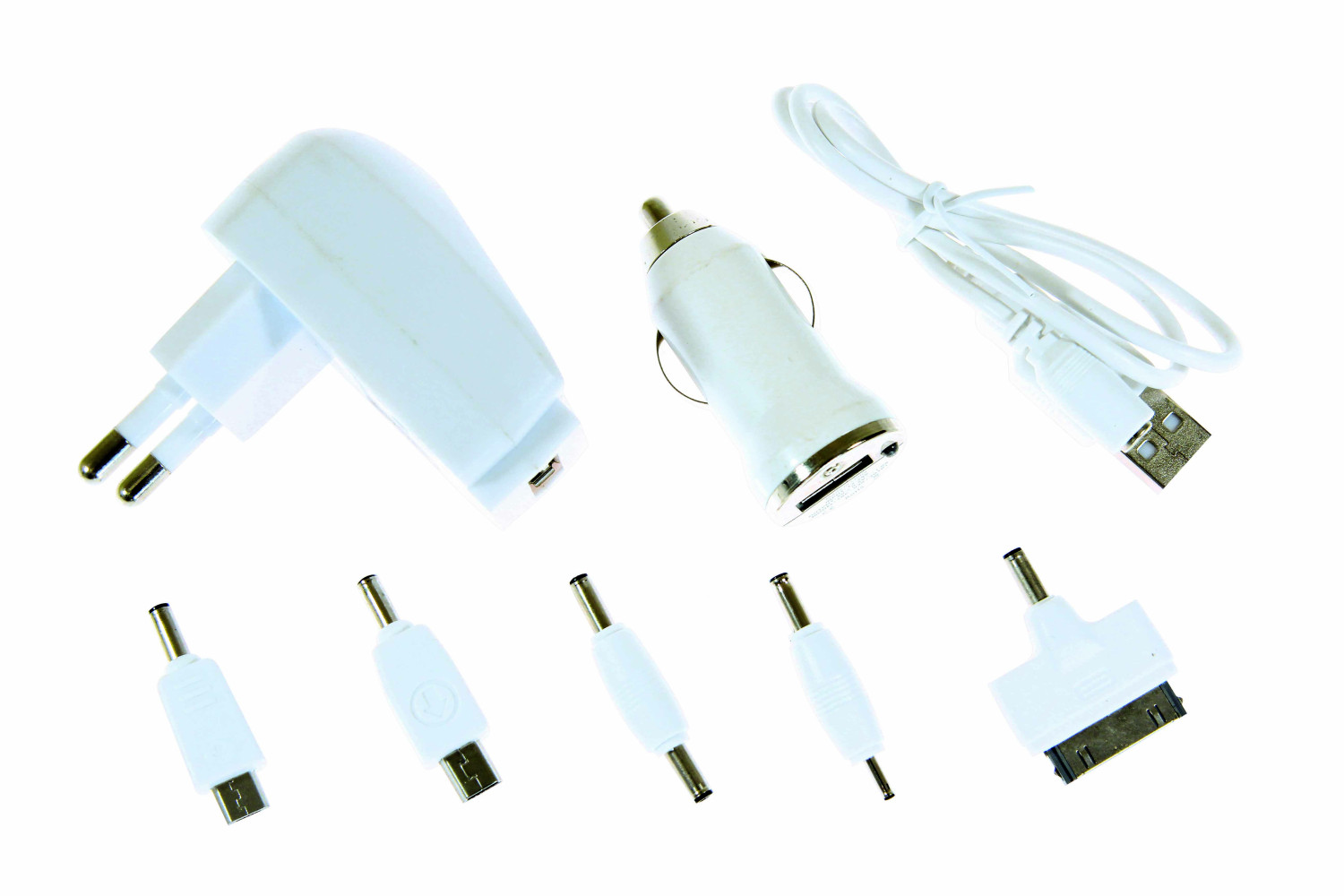 Nabíjačka pre napájanie či nabíjanie inteligentných mobilných telefónov, MP3 prehrávačov a ďalších zariadení schopných dobíjania či napájania pomocou niektorého z priložených adaptérov či pomocou klasického USB kábla z 12 V či 24 V zásuvky autozapaľovača alebo zo zásuvky 230 V. Balenie obsahuje nabíjačku USB, prepájací kábel s dĺžkou 45 cm a súpravu 5 adaptérov iPhone 4 a 3, microUSB, miniUSB, Nokia (3,5 a 2 mm) vhodných pre telefóny iPhone, Nokia, Blackberry, Motorola, Samsung a ďalšie. Výstup 5 V, 1000 mA.