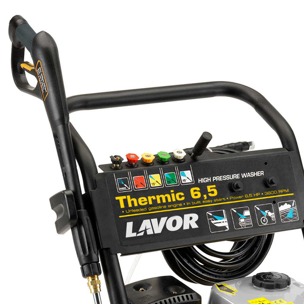 Parametry Thermic 6,5 s motorem 6.5 HP s 3600 ot./min., s maximálním výstupním tlakem 210 bar a průtokem 690 l/h řadí tento vysokotlaký čistič mezi profesionální stroje.