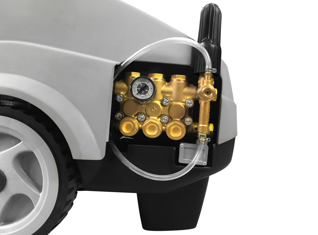 Sací a výtlačné ventily jsou vyrobeny z kvalitní nerezové oceli. Tlaková myčka má integrovanou nádrž na čisticí prostředek o objemu 2,8 l.