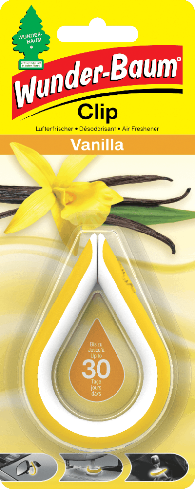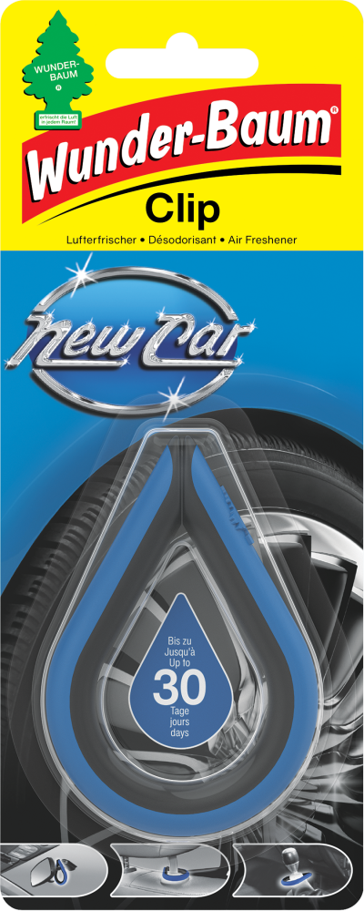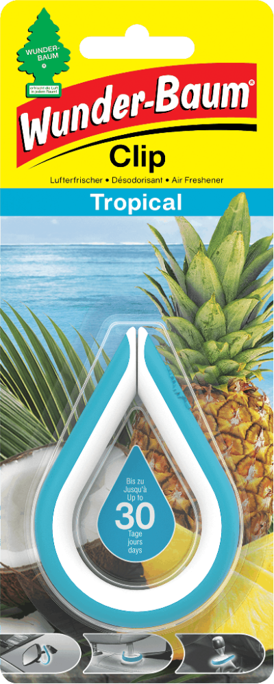 WUNDER-BAUM Clip nabízí inovativní styl pro umístění kdekoliv v autě, doma či v kanceláři. Je vyroben novou pokrokovou polymerovou technologií, která zajišťuje dlouhotrvající vůni. Jeho použití je velice snadné.